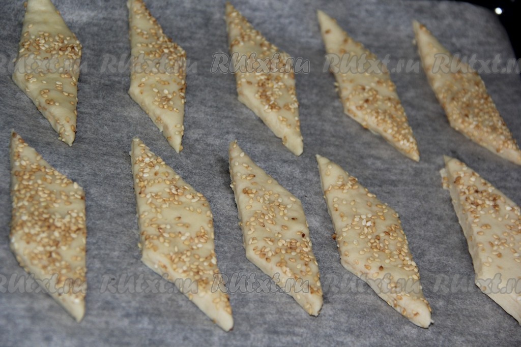 Нарезать получившуюся слоёную заготовку ножом на ромбовидное (или квадратное, или любой другой формы) печенье, переложить на противень, застеленный пергаментом, на небольшом расстоянии друг от друга и поставить в заранее разогретую духовку. Выпекать печенье при температуре 180 градусов примерно 25 минут (до лёгкого зарумянивания, выпечка получится светлой).