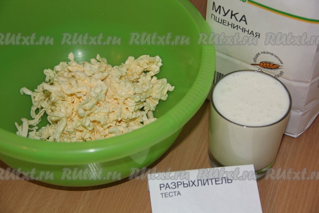 В глубокую миску натереть холодное сливочное масло на крупной тёрке, затем добавить соль, сахар, тщательно перемешать вилкой, влить кефир, перемешать. Всыпать разрыхлитель, небольшими порциями начать добавлять просеянную муку, замешивая тесто вначале ложкой, а затем продолжить замешивать его руками.
