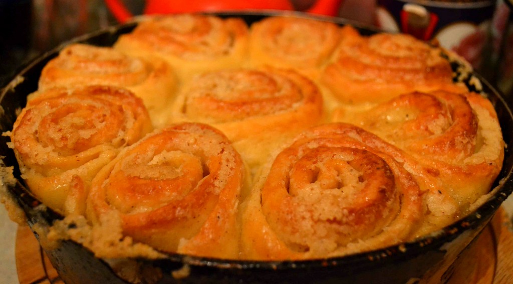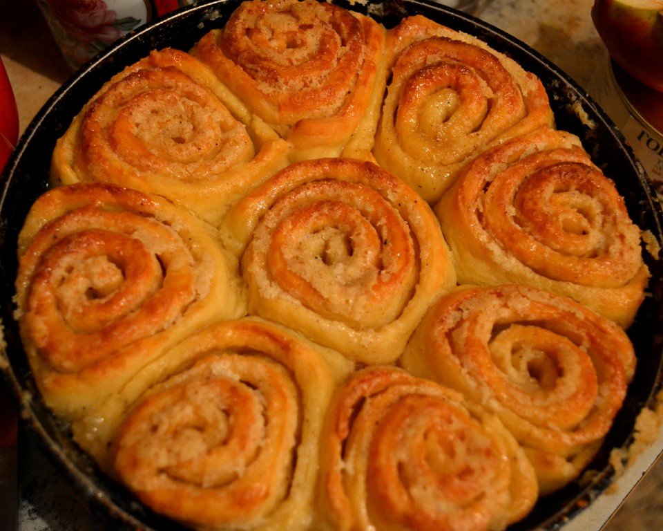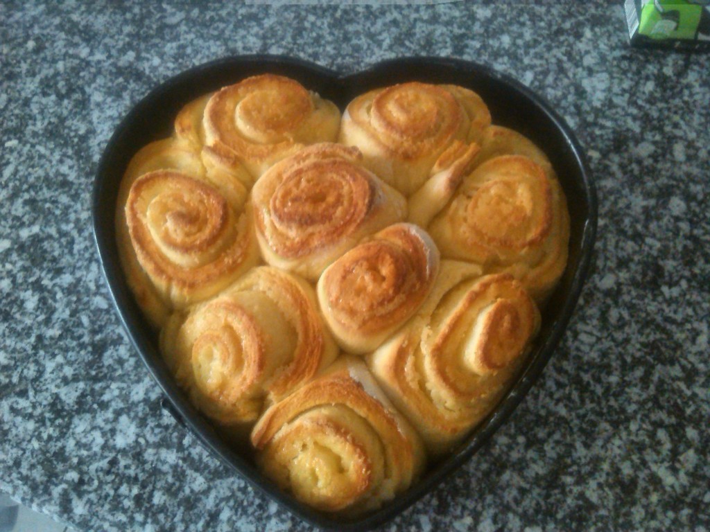 По прошествии 15 минут влить к улиткам оставшуюся молочную заливку и готовить булочки ещё где-то 20 минут (до коричнево-красного цвета).