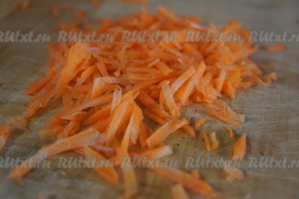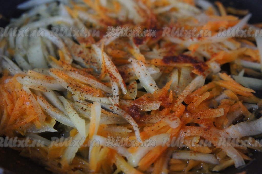 Хорошо разогреть растительное масло в сковороде, выложить морковку с луком и обжарить, периодически помешивая, на среднем огне до мягкости овощей (ориентировочно в течение 7-8 минут), немного посолить, добавить специи (я добавила чёрный молотый перец и паприку), перемешать, снять с огня, дать немного остыть.