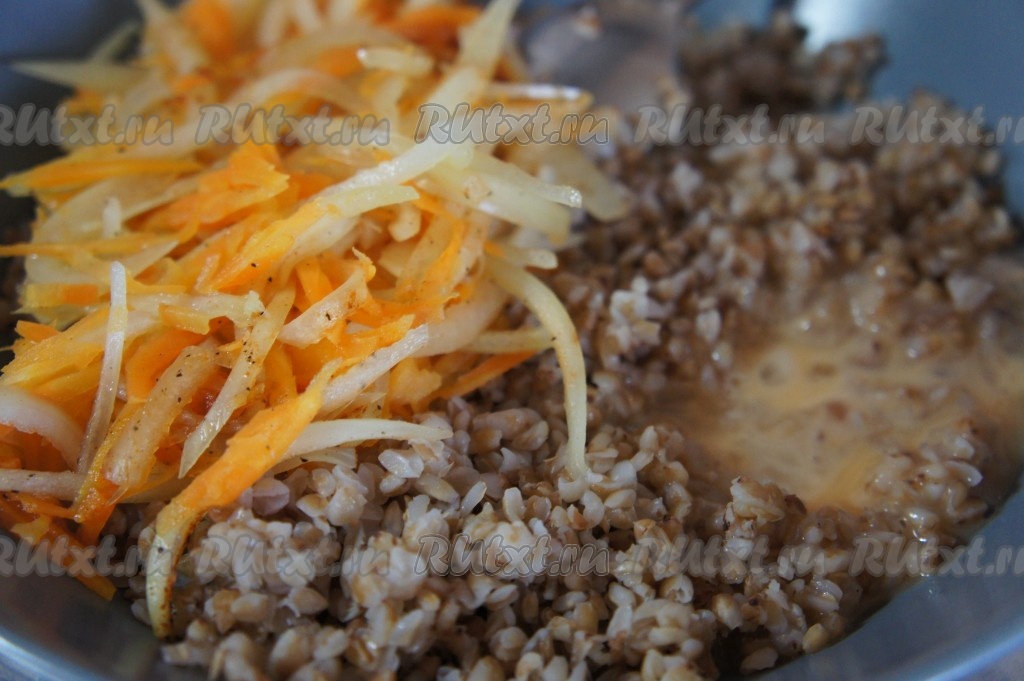 Гречневую кашу переложить в миску, добавить обжаренные овощи, яйцо, если нужно, досолить, перемешать.
