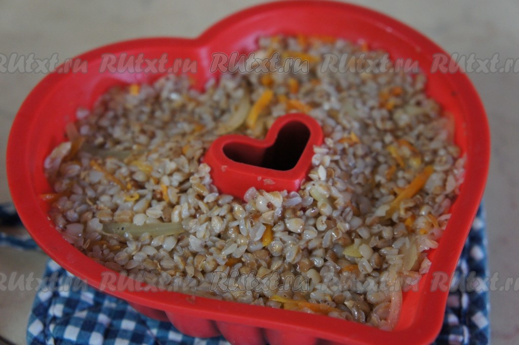 Форму для выпечки слегка смазать растительным маслом (если у вас, как и у меня, силиконовая форма, тогда её можно маслом не смазывать), выложить гречневую кашу, смешанную с яйцом и овощами. Примять и разровнять столовой ложкой.