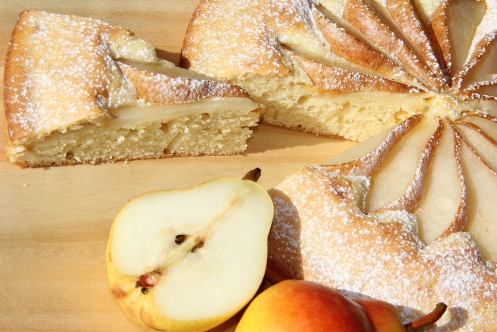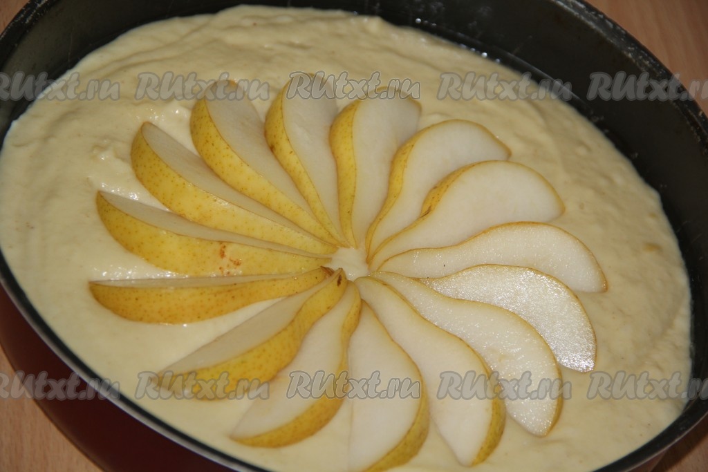 Духовку заранее разогреть до 180 градусов. Выложить тесто в форму для выпечки, смазанную растительным маслом. Груши нарезать, удалить семена. Выложить кусочки груши на тесто в виде цветка, как на фото.