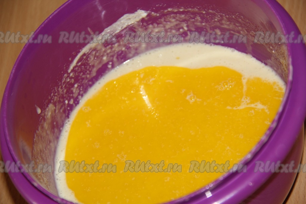 В объёмной миске взбить венчиком яйца с сахаром до однородности. Затем добавить набухшую манку, перемешать.