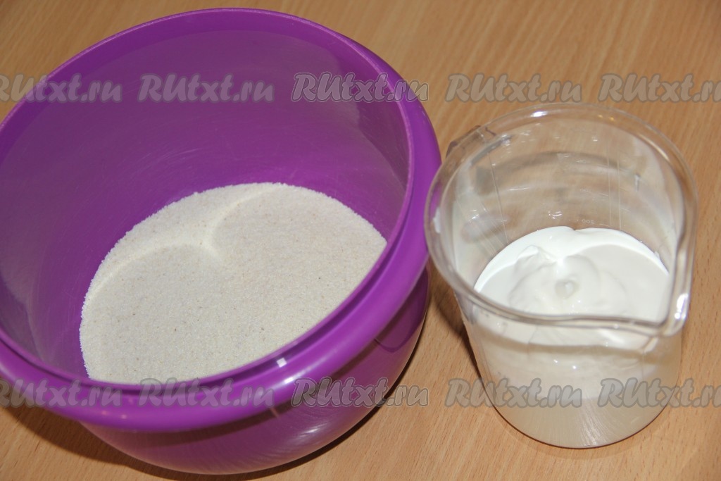 В небольшую ёмкость выложить сметану, всыпать манку, тщательно перемешать и оставить минут на 30 для набухания манки.