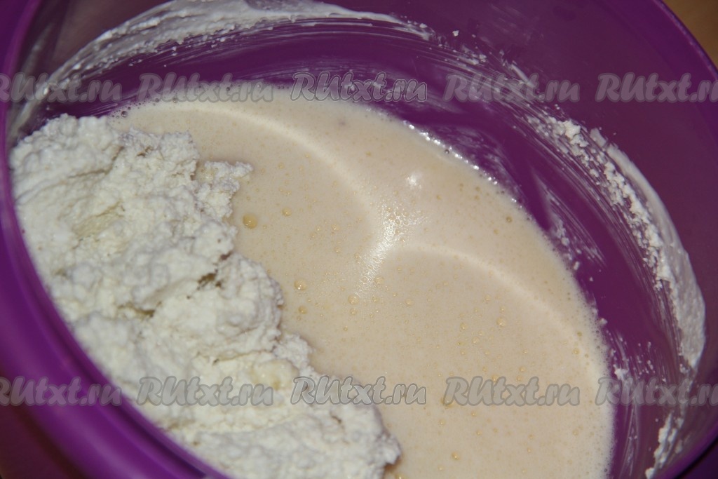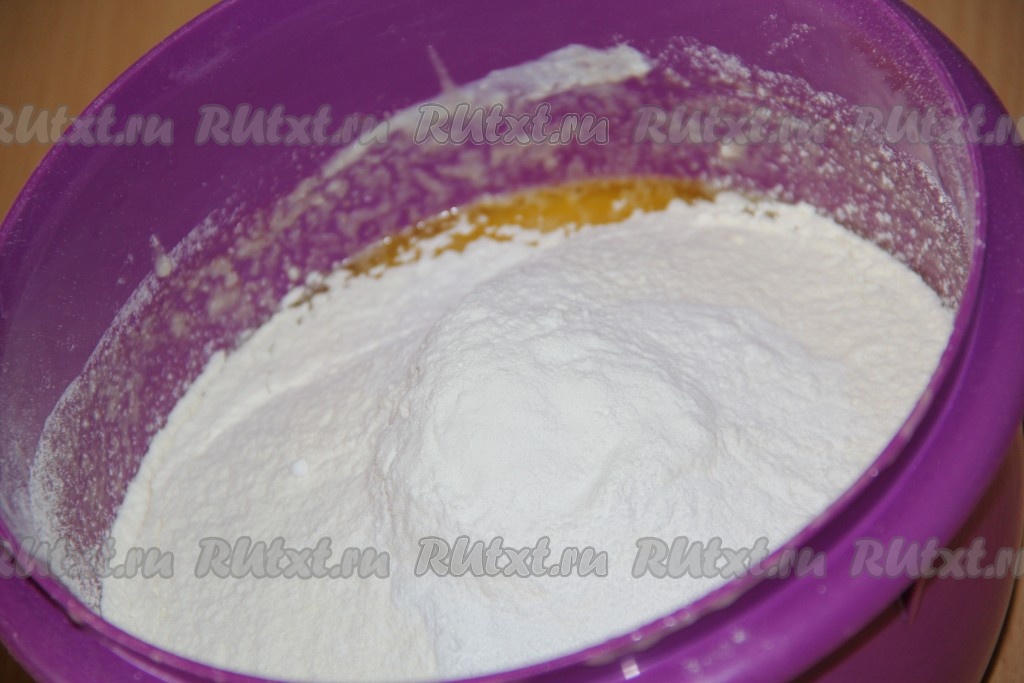 Затем добавить разрыхлитель, частями начать добавлять просеянную муку, хорошо перемешивая. Тесто для манника, замешанное на сметане, по консистенции должно получиться, как достаточно густая сметана.