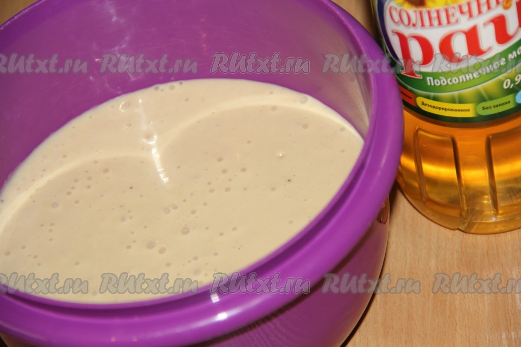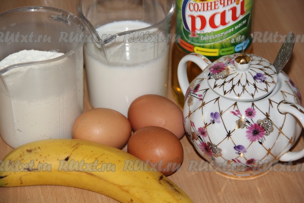 Банан очистить от кожуры, нарезать на кусочки и растереть его в пюре вилкой. Затем добавить к банановому пюре яйца, соль, сахар, молоко, хорошо взбить венчиком. Всыпать просеянную муку и ещё раз взбить. Добавить 3 столовых ложки растительного масла и хорошо перемешать ложкой. Тесто получается не густым, оно будет хорошо растекаться в дальнейшем по сковороде.