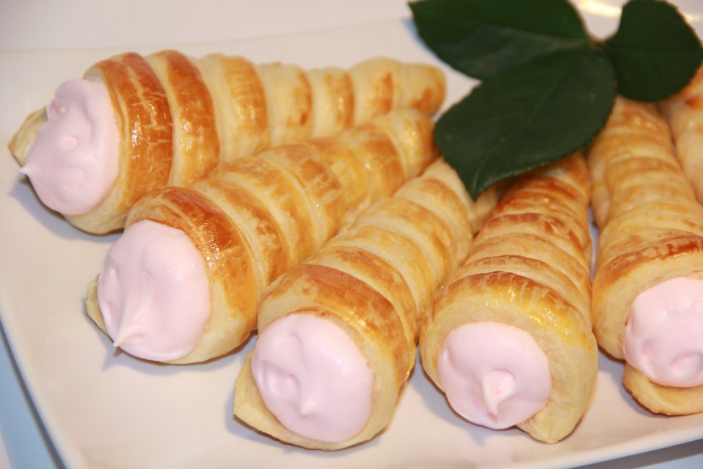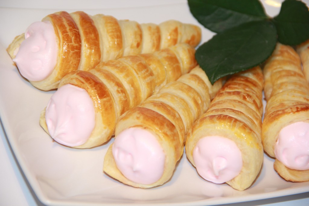 Охлаждённые сливки взбить с сахарной пудрой до стойких пиков. Я слегка окрасила сливки клубничным сиропом, добавив пару капель сиропа во время взбивания. Наполнить трубочки сливками, я это сделала с помощью кондитерского шприца, и можно подавать к столу. Рецепт приготовления слоеных трубочек прост, но наполнив их начинкой, вы получите лакомство, от которого не смогут отказаться ни дети, ни взрослые.