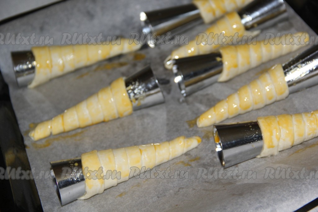 Выпекать трубочки при температуре 200 градусов примерно 15 минут до золотистого цвета. Готовые слоеные трубочки остудить на конусах, а затем снять.