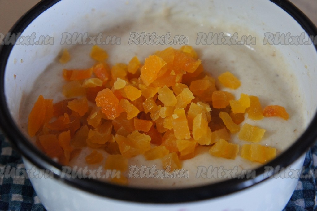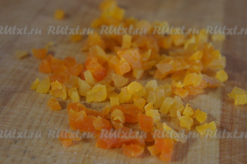 Курагу залить кипятком и оставить минут на 5, затем воду слить. Выложить курагу на бумажное (или тканевое) полотенце, оставить не несколько минут, чтобы она обсохла, а затем мелко нарезать.