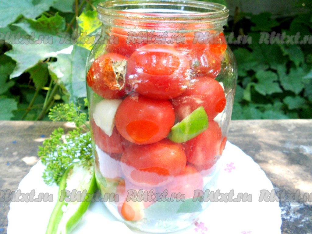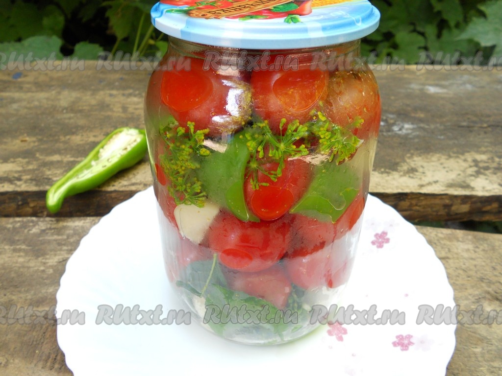 Заполнить банку помидорами черри. Между помидорами разместить оставшийся нарезанный болгарский перец, 1-2 зубчика чеснока, по желанию, можно добавить кусочек горького перца.