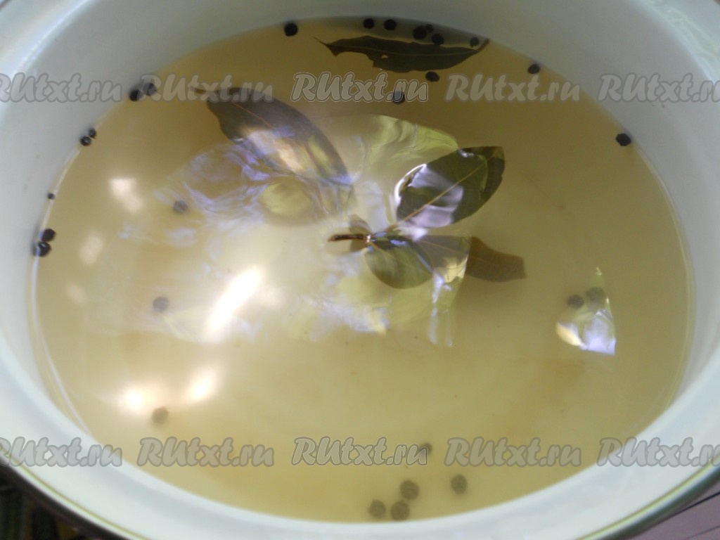 Снова влить в банку с помидорами чистую кипящую воду. Прикрыть банку крышкой и оставить минут на 5, после этого снова вылить воду в раковину. Пока помидоры в банке второй раз залиты кипятком, нужно сварить маринад. Для этого в кастрюлю нужно влить 500 миллилитров воды, добавить соль, сахар, лавровые листья и горошины чёрного перца, перемешать, дать закипеть, проварить 2-3 минуты, чтобы сахар и соль полностью растворились, затем влить в кастрюлю уксус, дать закипеть и сразу убрать маринад с огня.