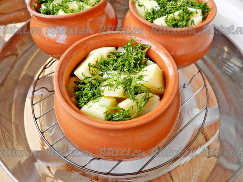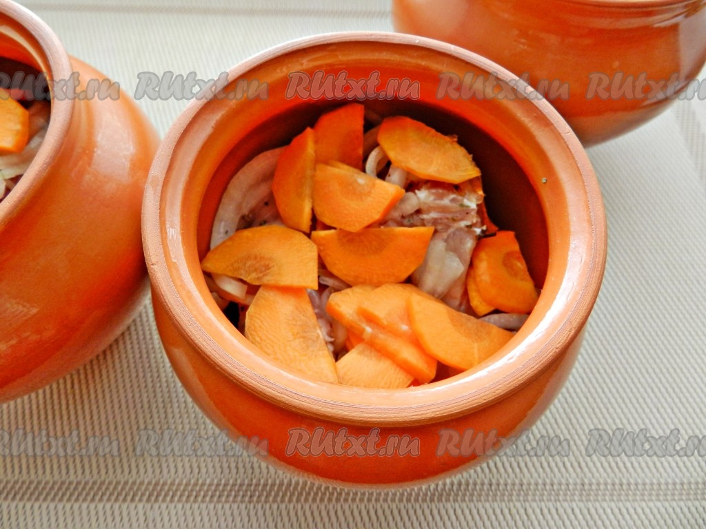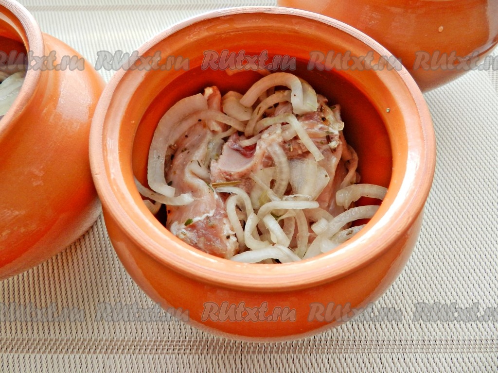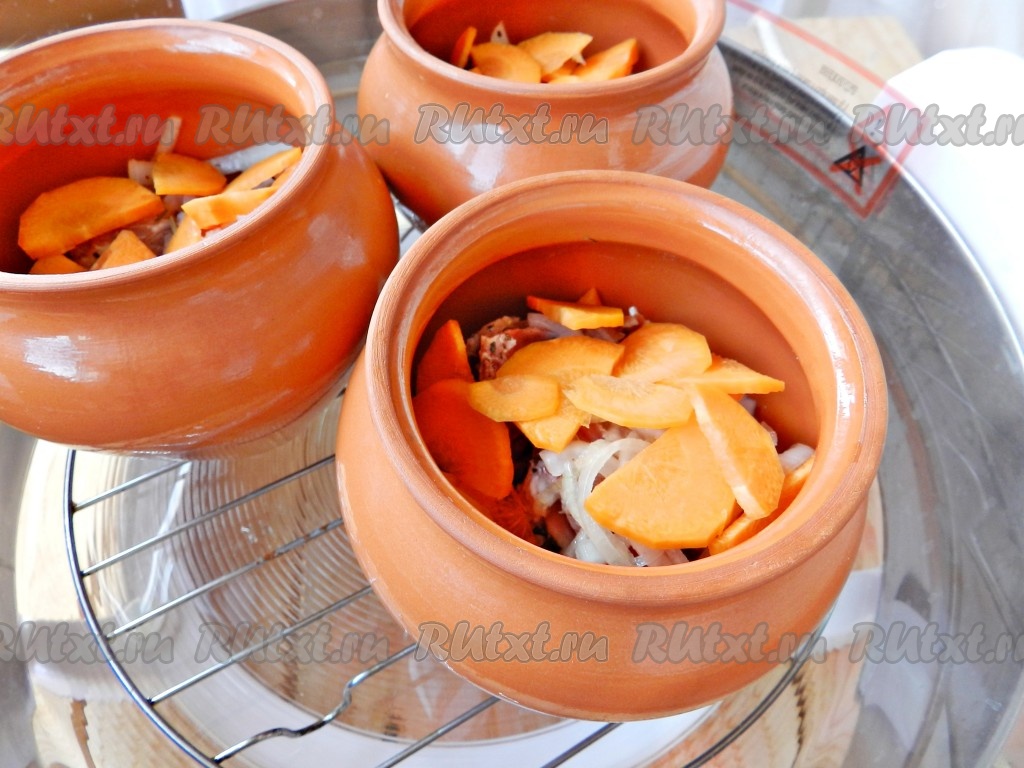 Глиняные горшочки смазать внутри растительным маслом. Мясо разложить по горшочкам.