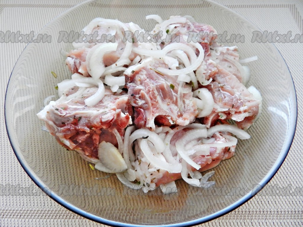 Свиные ребрышки вымыть, обсушить и разрезать. Нарезать полукольцами луковицу. Смешать мясо с луком, солью, перцем и сухими травами. Оставить на 2 часа в холодильнике.