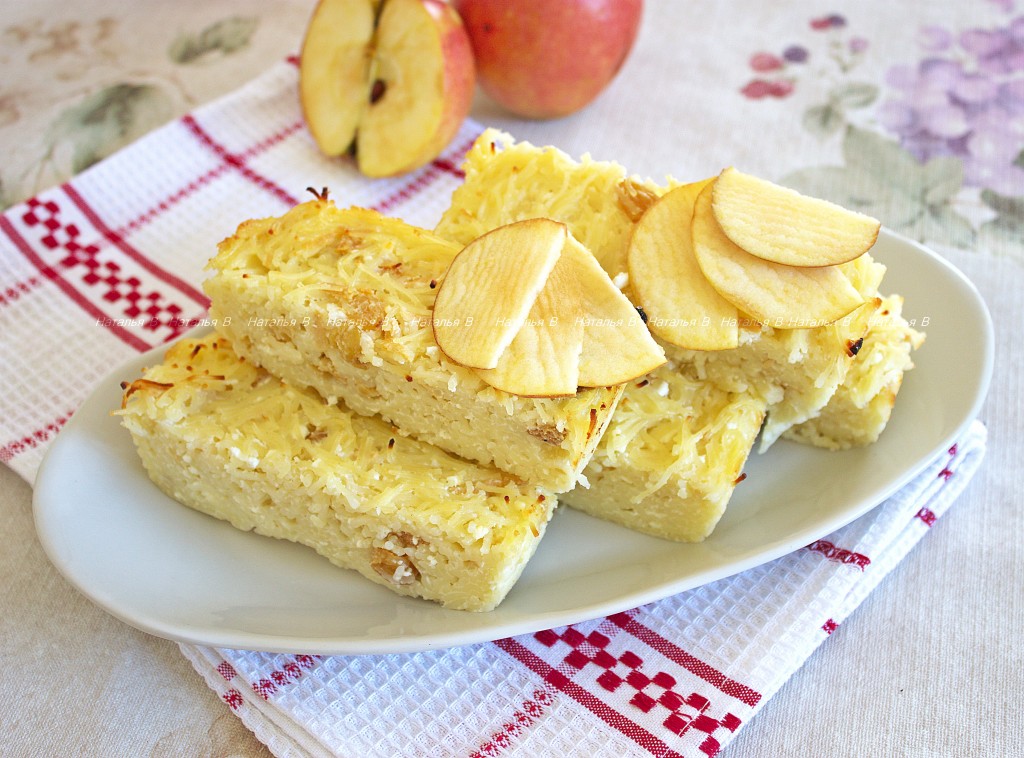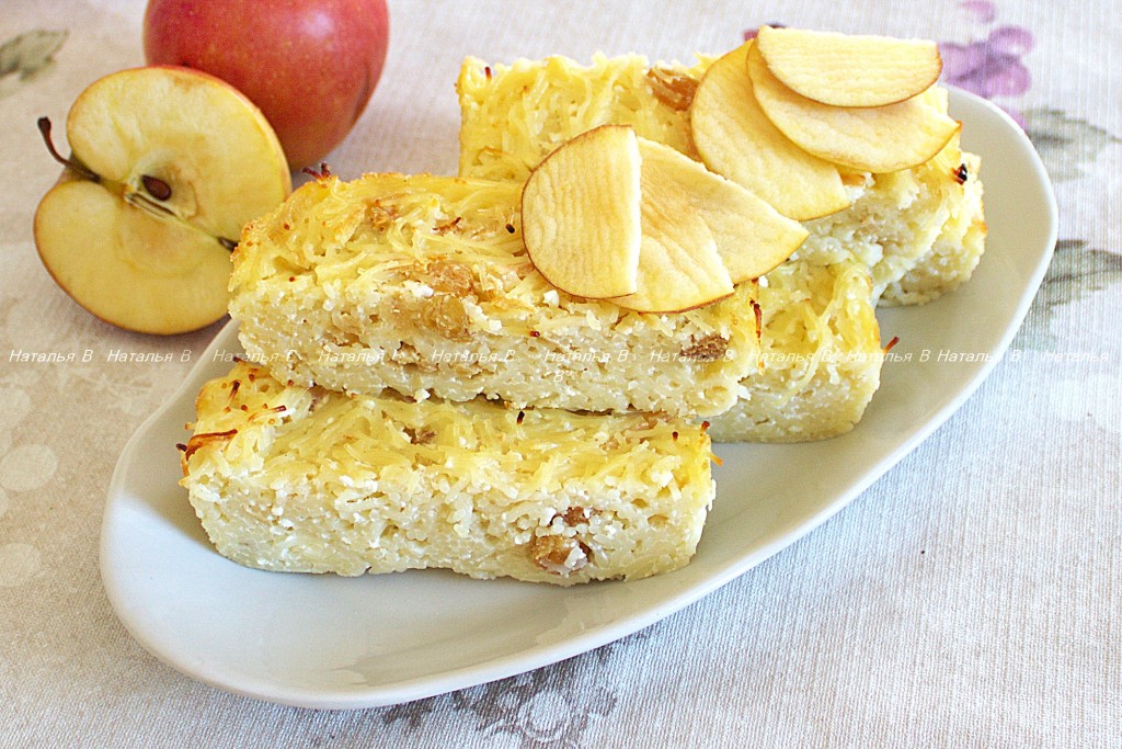 При подаче очень вкусный лапшевник с творогом, яблоком и изюмом нарезать на порционные кусочки и полить растопленным сливочным маслом.