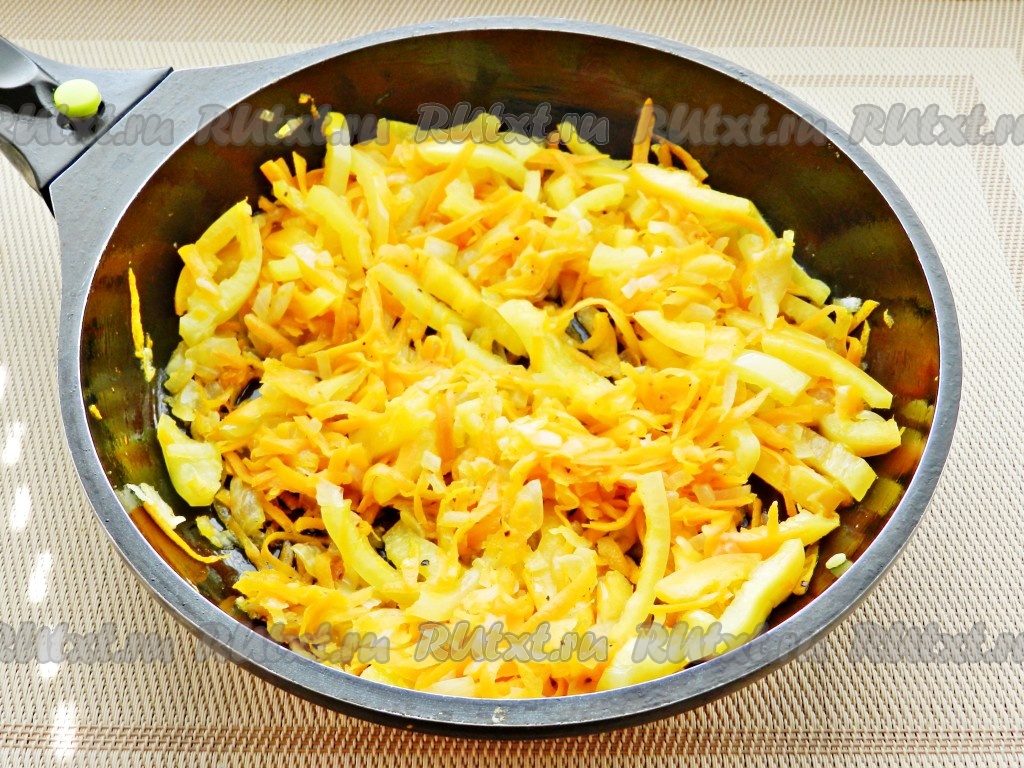 В сковороде разогреть растительное масло и обжарить сначала лук и морковь до золотистого цвета. Затем добавить болгарский перец, обжарить все вместе, посолить, поперчить, приправить паприкой.