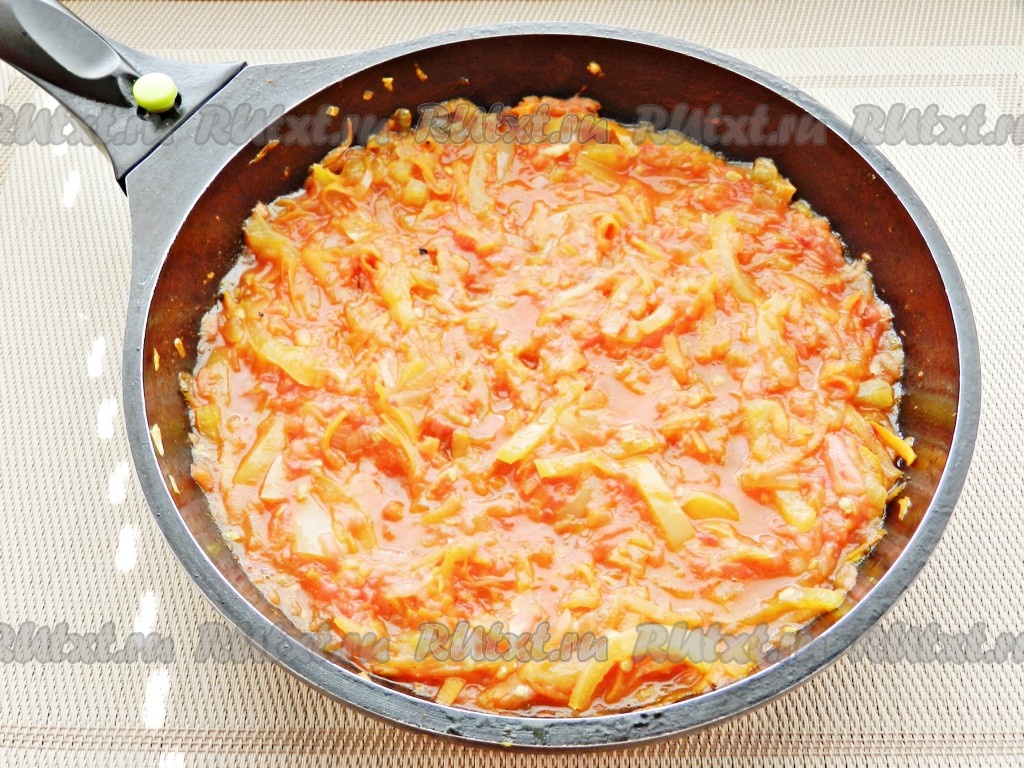 Добавить протертые помидоры и потушить все вместе 5-7 минут.