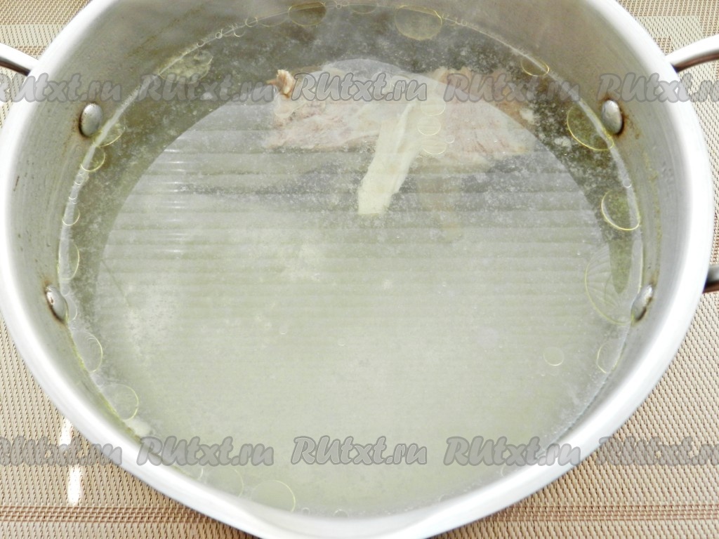 Из мяса приготовить бульон. Когда мясо будет готово, посолить бульон, добавить в него картофель и рис, сварить до готовности.