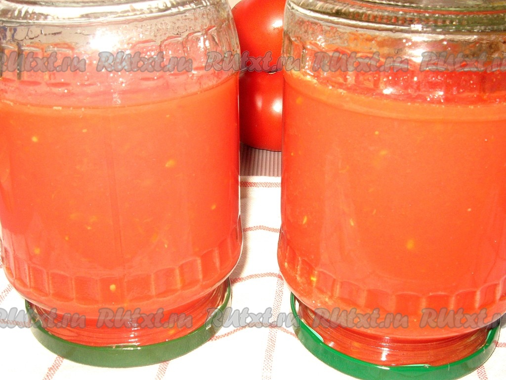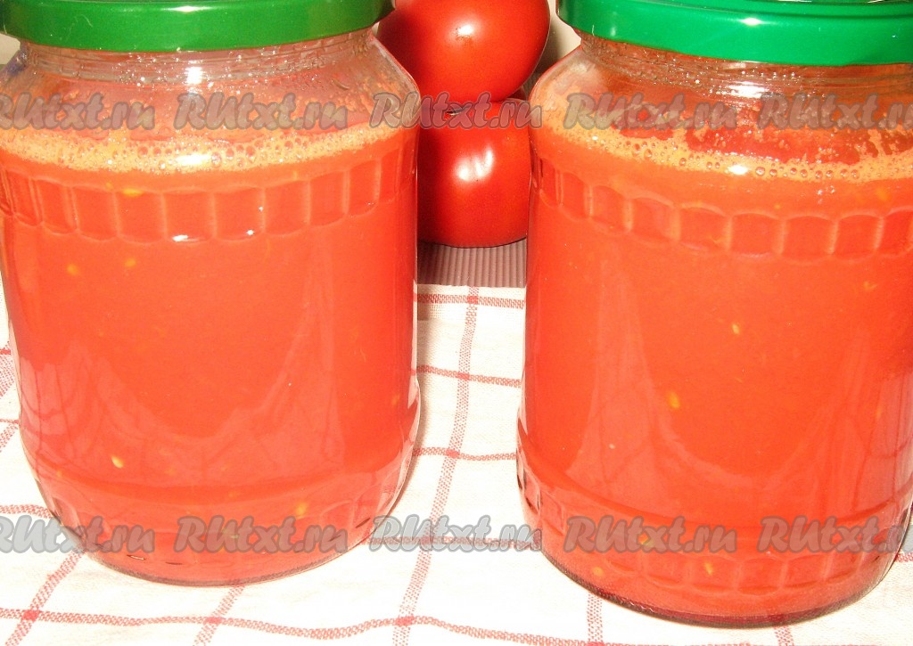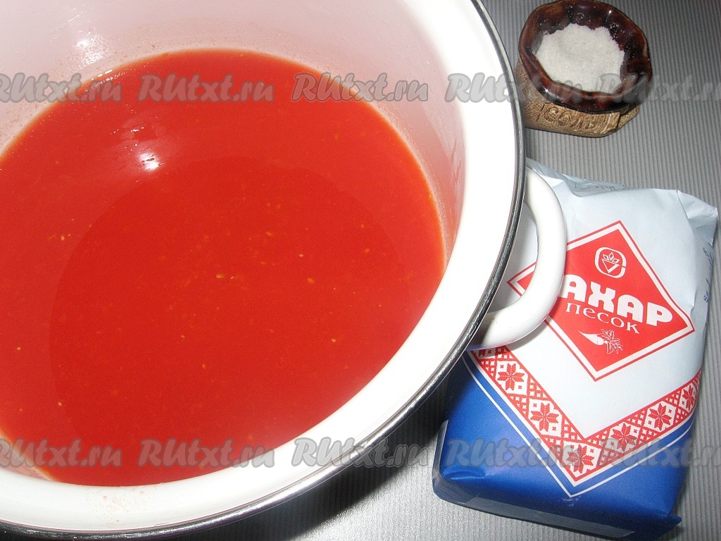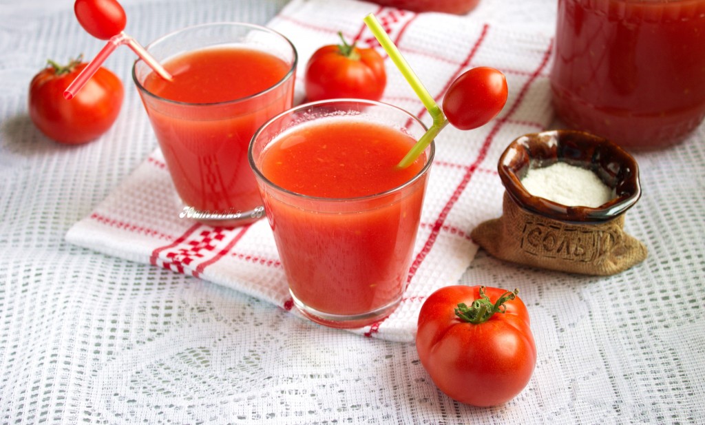 Сок перемешать и снова поставить на огонь, довести до кипения и снять с огня. Горячий домашний томатный сок разлить по стерилизованным банкам, плотно закрыть (если винтовые крышки) или закатать железными крышками.