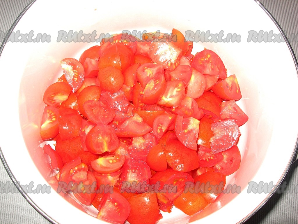 Помидоры хорошо вымыть, разрезать на 4 части.