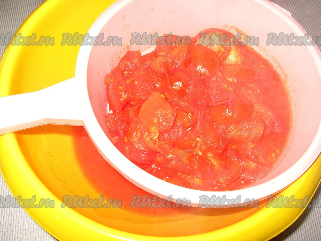 Затем горячие помидоры тщательно протереть через сито ( я протерла через дуршлаг с маленькими дырочками), тем самым отделяя сок от кожицы и семян. Если немного семян попадет в сок - не беда - на вкус это никак не повлияет, но если они вас смущают, то сок можно еще раз пропустить через мелкое сито!