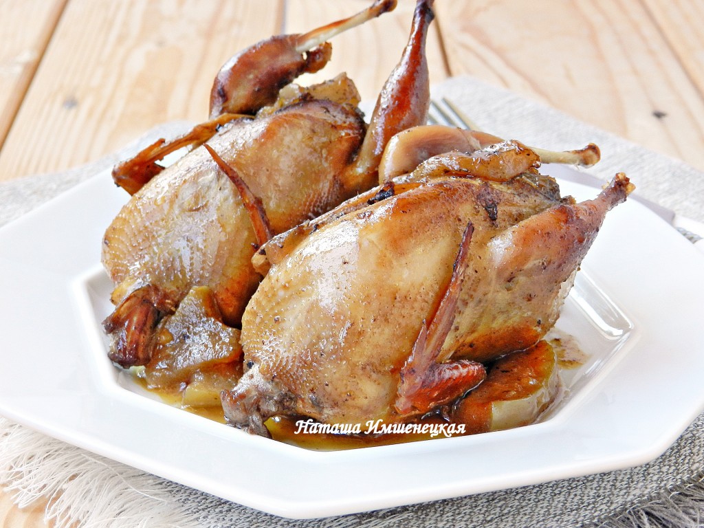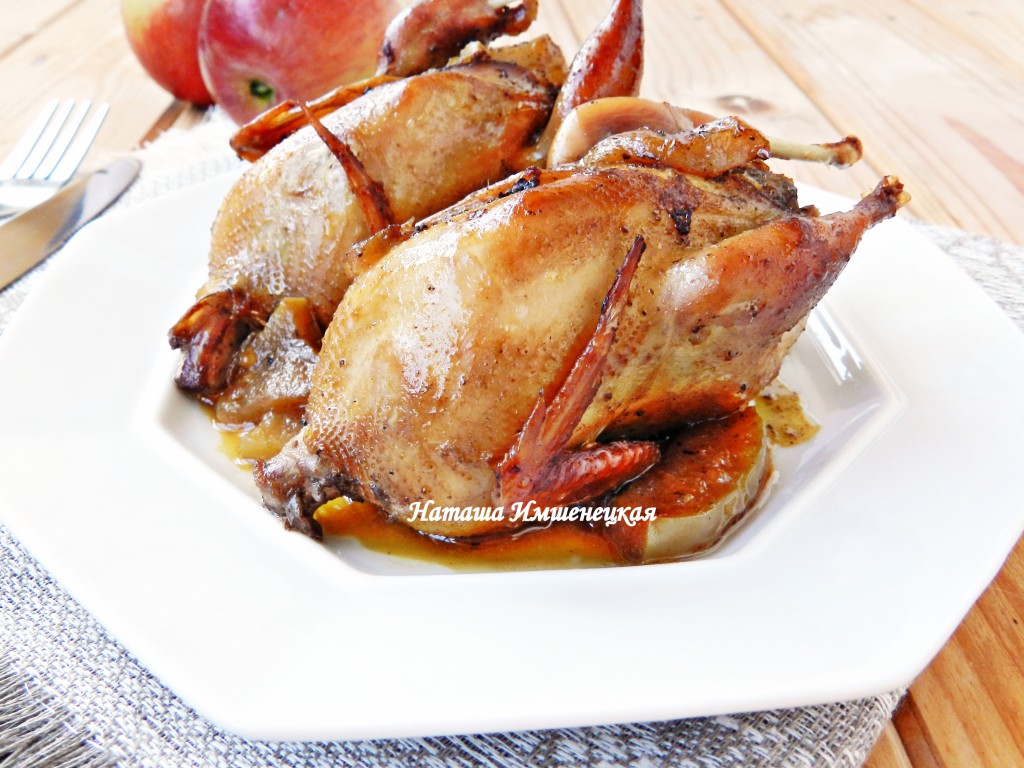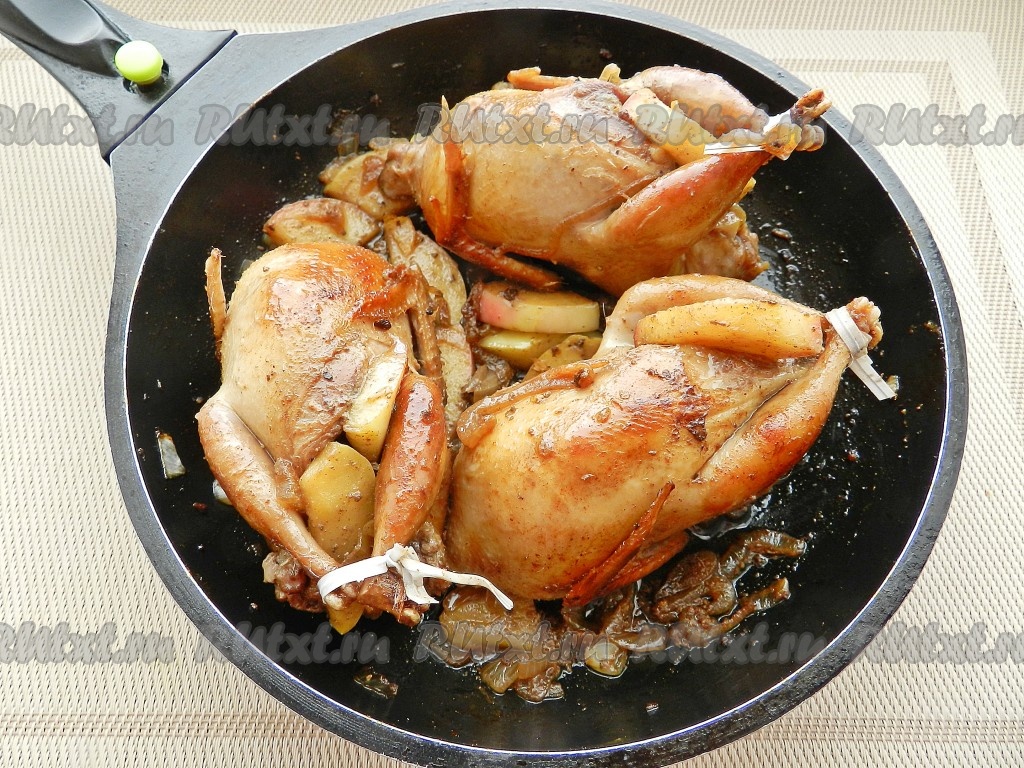Перепелок нафаршировать печенью, яблоками и луком. Связать им ножки. В форму для запекания выложить перепелок и оставшиеся от начинки яблоки вместе с маслом. (Я использовала для запекания ту же сковороду, где жарились перепелки и начинка). Накрыть форму фольгой и поставить в разогретую до 200 градусов духовку на 45-50 минут.