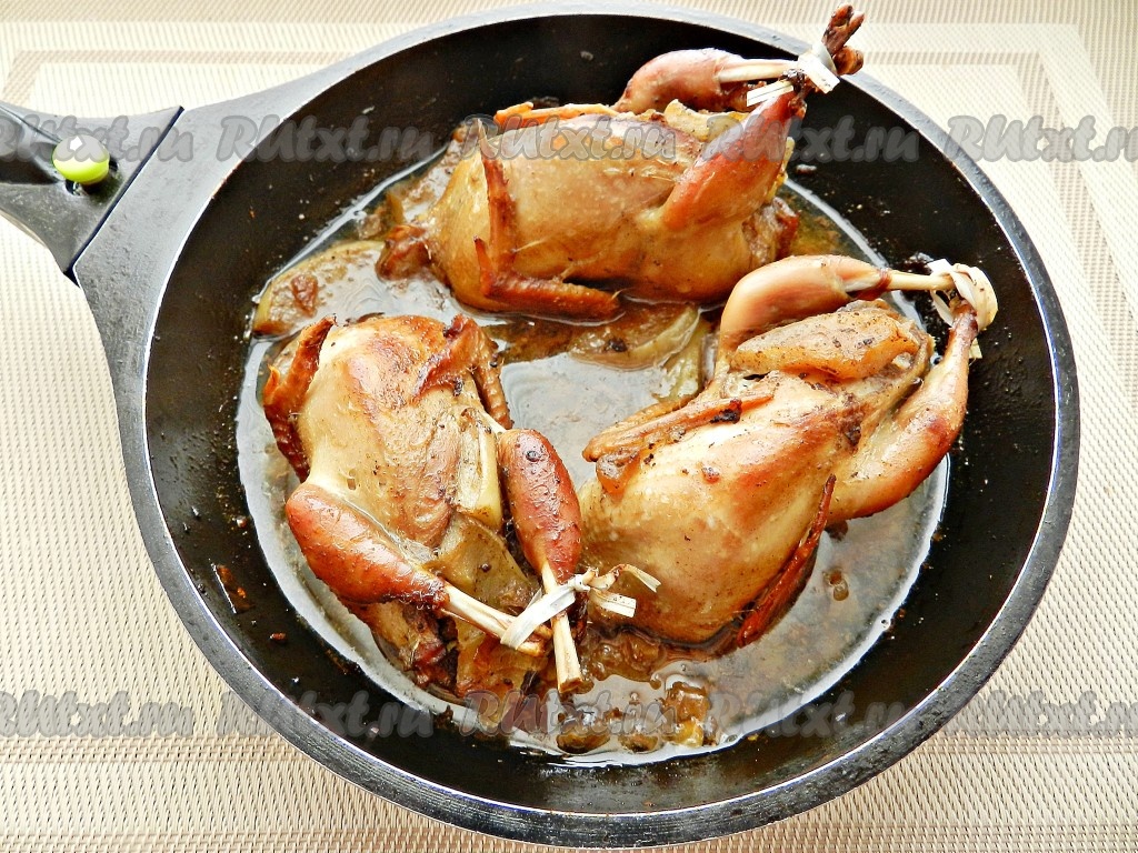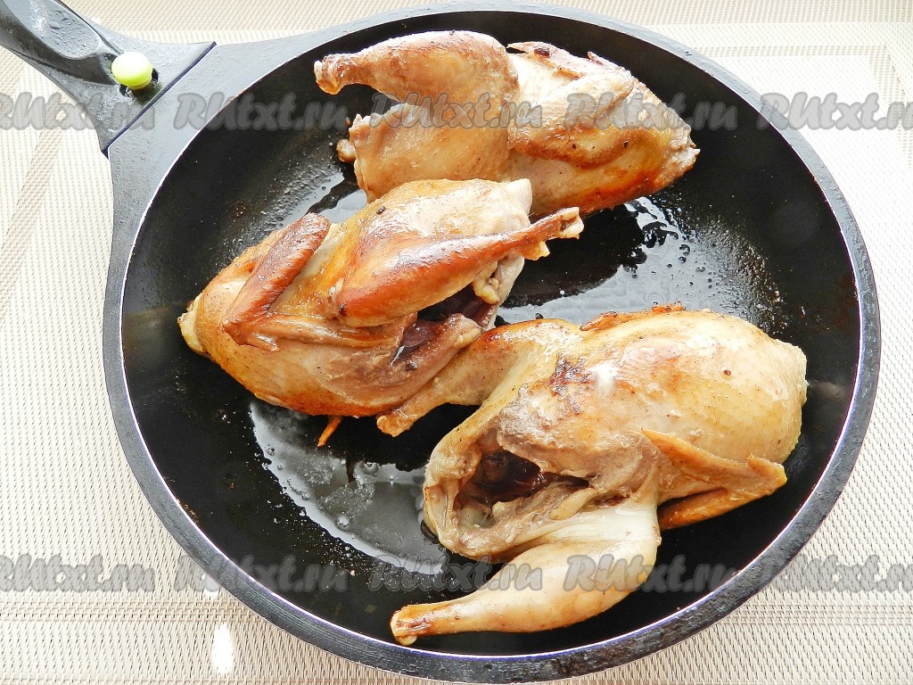 Затем обжарить перепелок на разогретом растительном масле до золотистого цвета. Обжаренных перепелок переложить со сковороды в другую посуду.