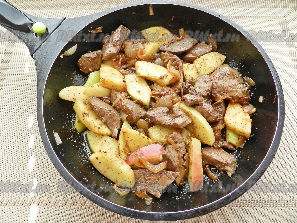 Нарезать дольками лук и яблоко, печень нарезать небольшими кусочками. В том же масле, где жарились перепелки, обжарить сначала лук, затем выложить печень, посолить, поперчить и обжарить 7-10 минут до прозрачного сока. Добавить в сковороду яблоки и готовить все вместе еще 1-2 минуты.