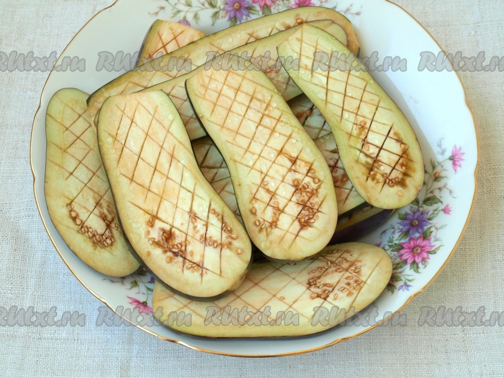 Баклажаны вымыть, удалить плодоножку, нарезать на пластины шириной около 7 миллиметров. С одной стороны ножом сделать достаточно частую сеточку на пластинах баклажанов. Посыпать баклажаны солью и оставить на 30 минут.
