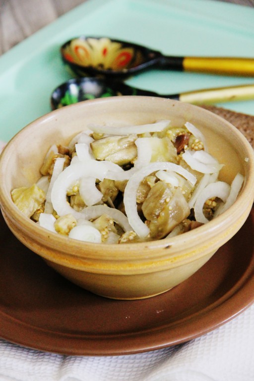Через сутки отправить баклажаны в холодильник и использовать по необходимости. Я достаю баклажаны, нарезаю кубиками, добавляю лук, нарезанный полукольцами, заправляю ароматным растительным маслом, перемешиваю и подаю к столу. Вот так достаточно просто и быстро можно засолить баклажаны, в результате вы получите закуску, напоминающую по вкусу грибы.