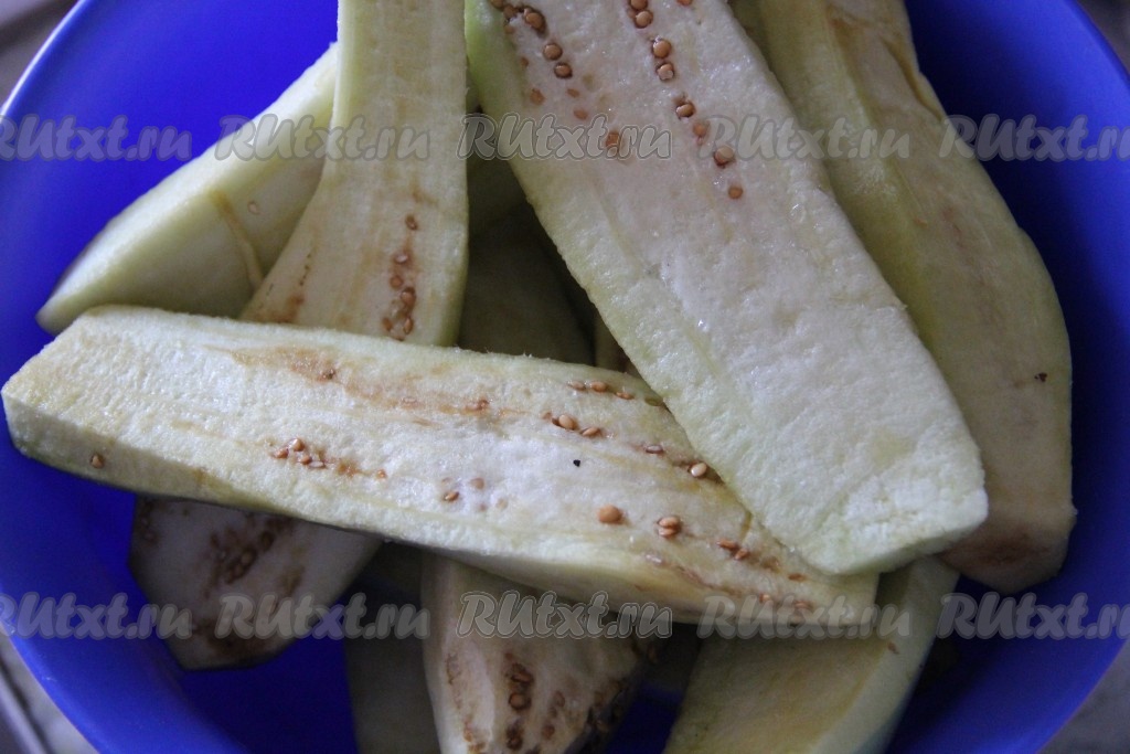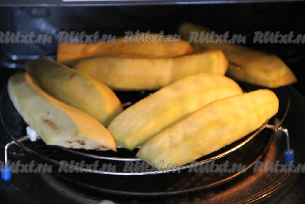 Баклажаны очистить от кожуры, разрезать вдоль на 2 части.