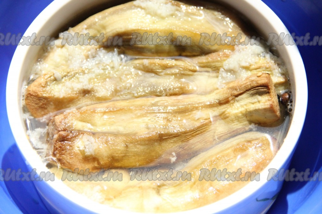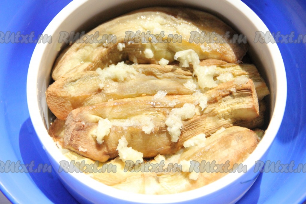 Готовые баклажаны выкладывать слоями, каждый слой баклажанов перемазывать выдавленным через пресс чесноком. Таким образом выложить все баклажаны.