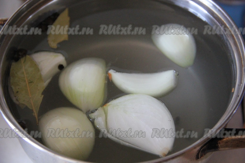 Приготовить рассол, для этого влить в кастрюлю 1 литр воды, добавить 2 крупно нарезанные очищенные луковицы, соль, сахар, горошинки чёрного перца, гвоздику и лавровые листочки, поставить на огонь, довести до кипения, дать провариться пару минут, чтобы полностью растворились сахар и соль. Снять рассол с огня, вынуть лук и лавровые листья, остудить рассол до комнатной температуры.