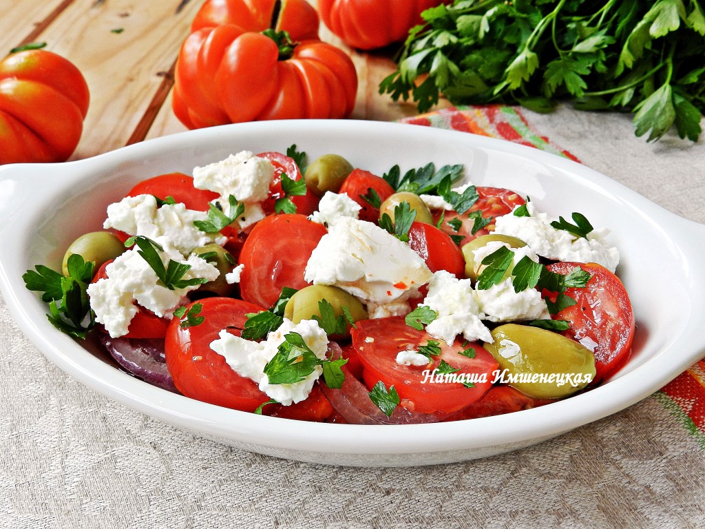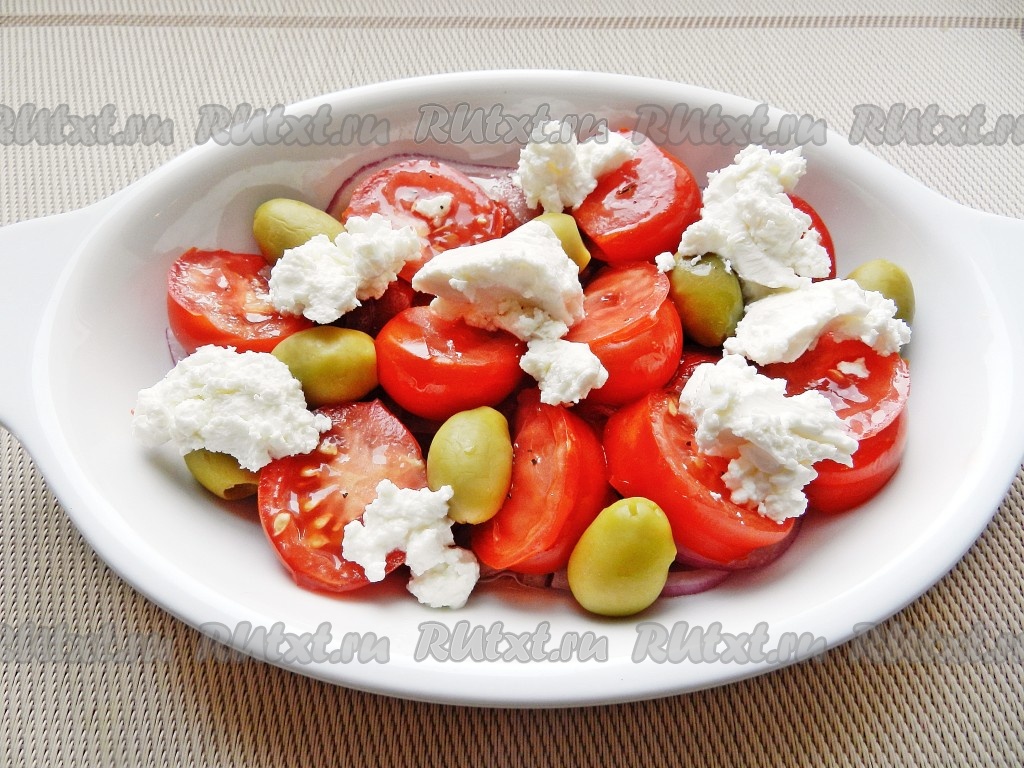 Добавить оливки и сыр, еще немного полить ароматным маслом. Добавить свежую зелень и подавать.