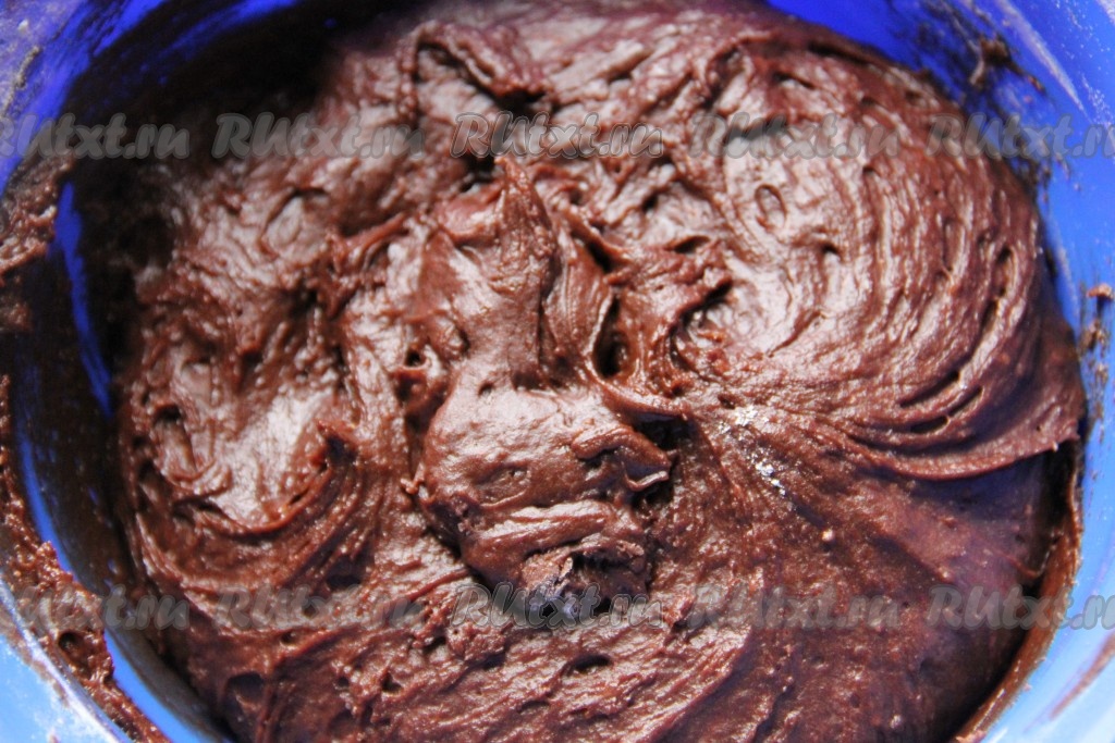 В получившуюся массу добавить разрыхлитель, частями начать добавлять муку, каждый раз полностью вмешивая её в тесто лопаткой (или ложкой). Шоколадное тесто должно получиться достаточно густым, мягким, немного липнущим к рукам (как на фото). Руками вымешивать тесто не нужно. Муки может понадобиться чуть больше или меньше, поэтому важно ориентироваться на консистенцию теста. Отправить тесто на 4 часа в холодильник. После охлаждения с тестом будет достаточно легко работать.