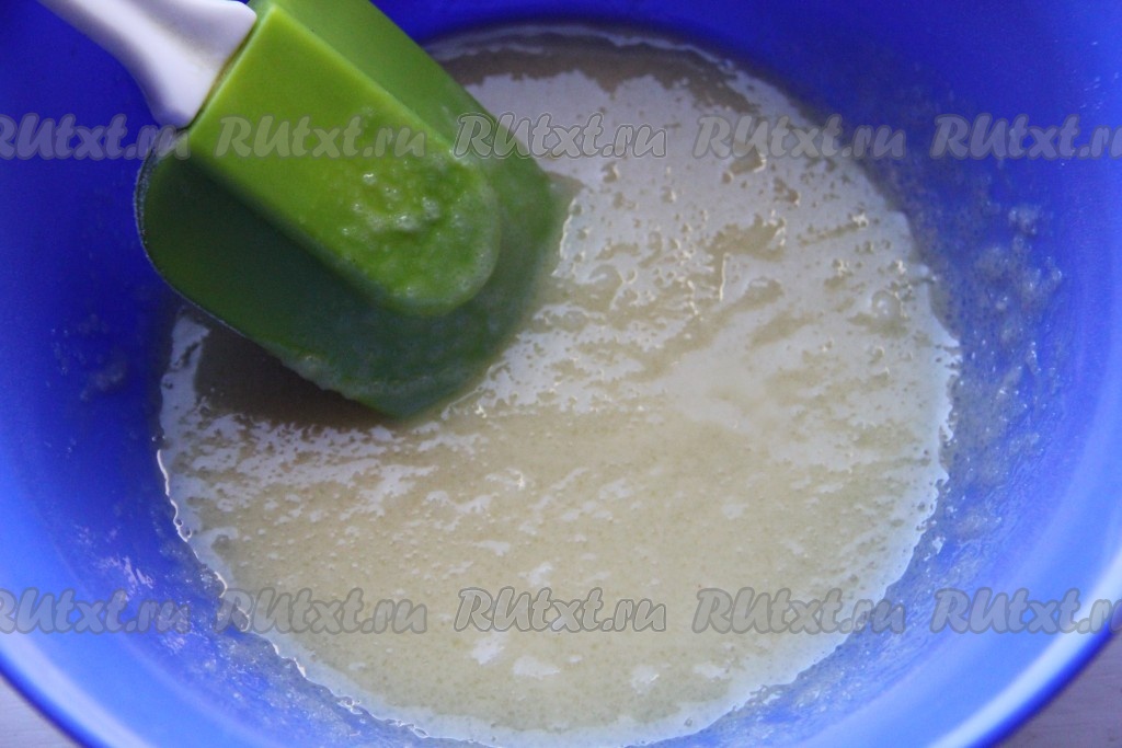 Сливочное масло растопить, дать немного остыть, перелить в глубокую миску, всыпать сахар. Тщательно растереть масло с сахаром с помощью лопатки (или ложки).