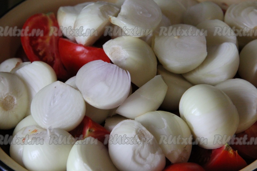 Помидоры и очищенный лук порезать на несколько частей.