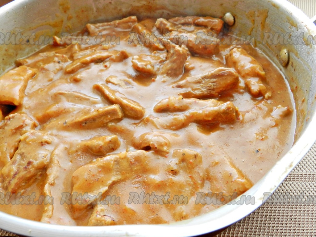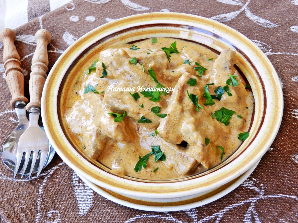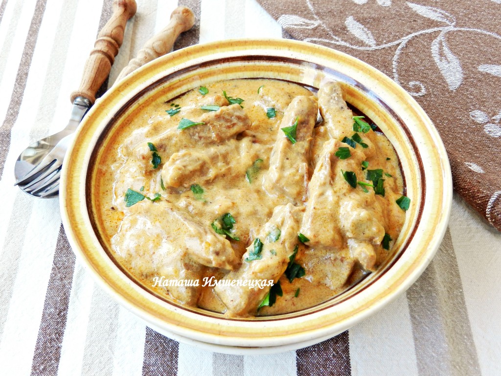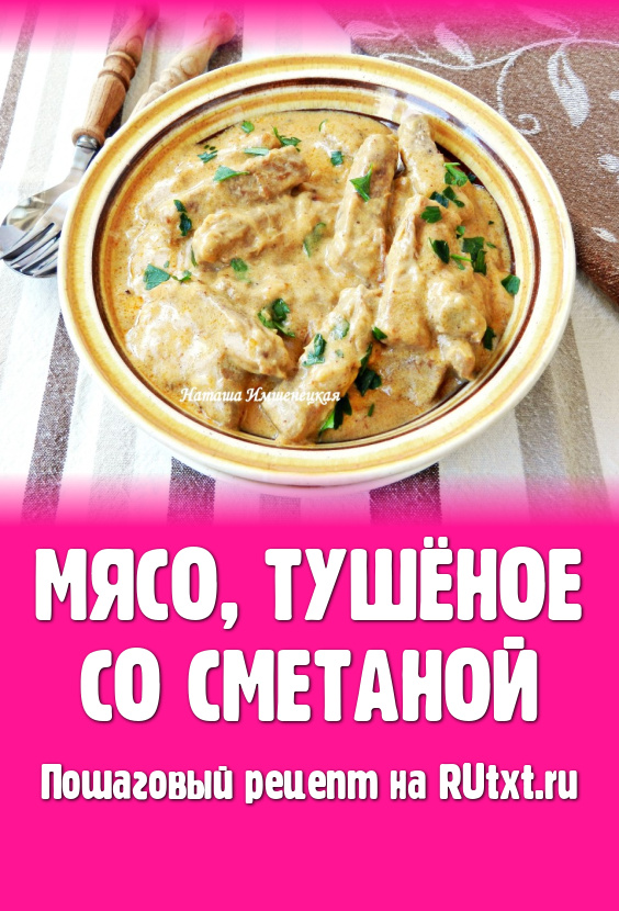Мясо, тушёное со сметаной. - простое, но вкусное блюдо для семейного обеда или ужина. Сочетание сметаны со специями придают мясу неповторимый вкус и аромат. Подавать мясо можно с любым гарниром на свой вкус.
