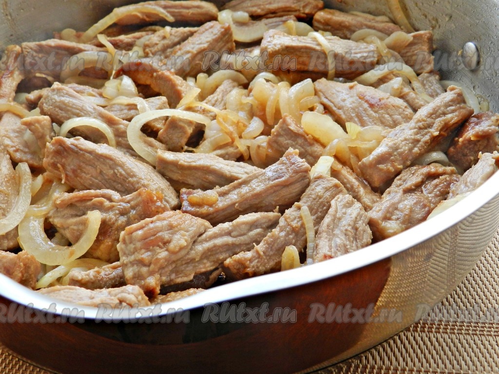 В глубокой сковороде разогреть растительное масло и обжарить мясо до золотистой корочки.