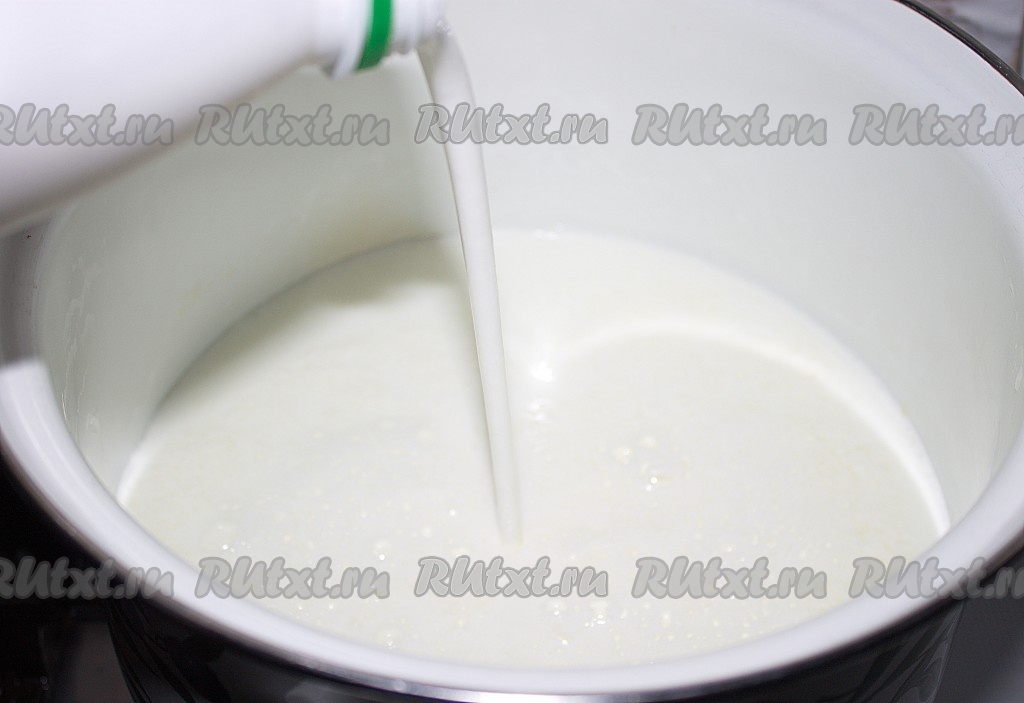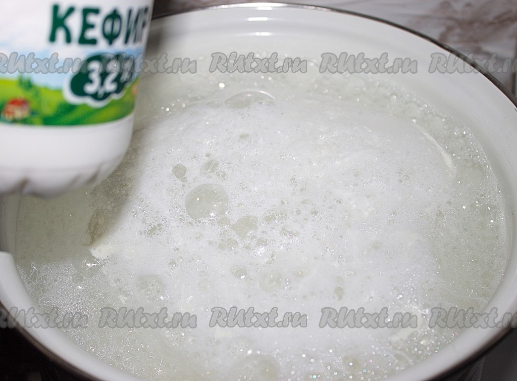 Молоко вылить в кастрюлю, поставить на огонь и довести до кипения. В кипящее молоко вылить кефир.