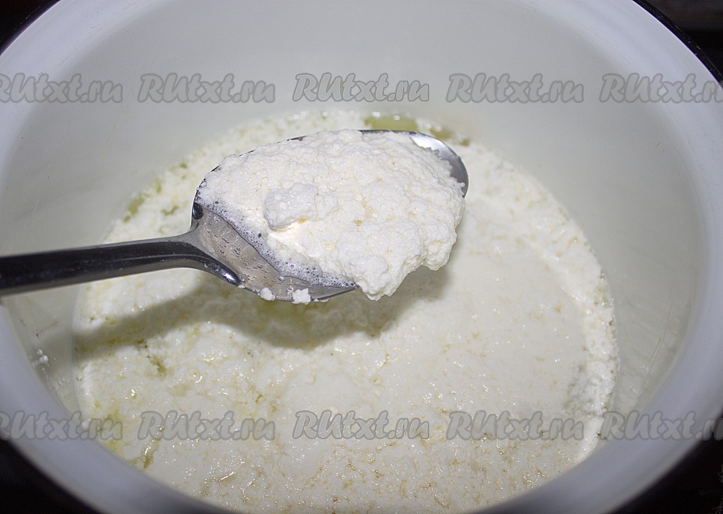 Через несколько минут смесь начнет расслаиваться на творог и сыворотку - это будет сразу видно, если слегка помешаете ложкой.