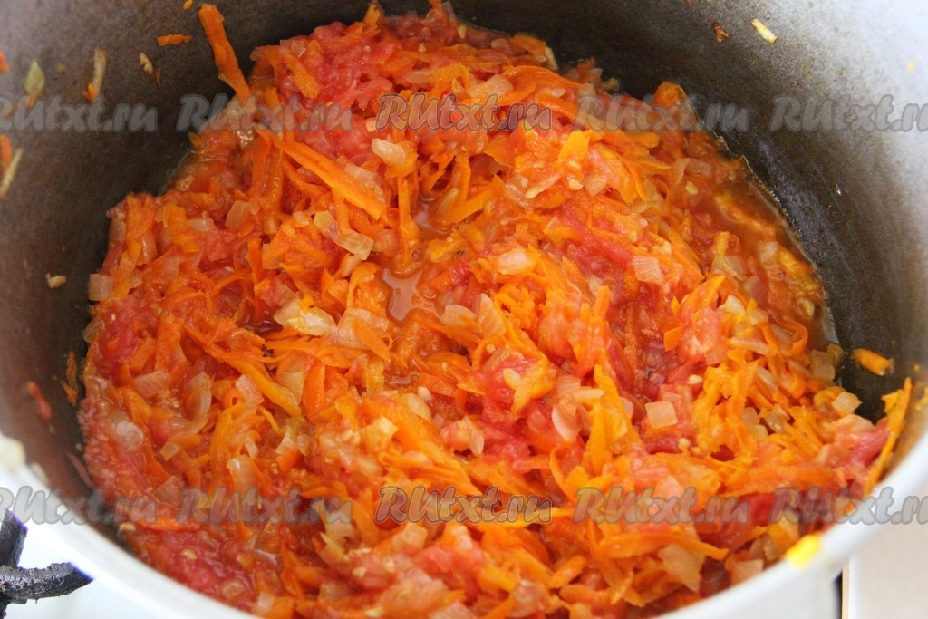 К луку с морковью добавить помидоры и острый перец, перемолотые на мясорубке. Проварить массу 10 минут.