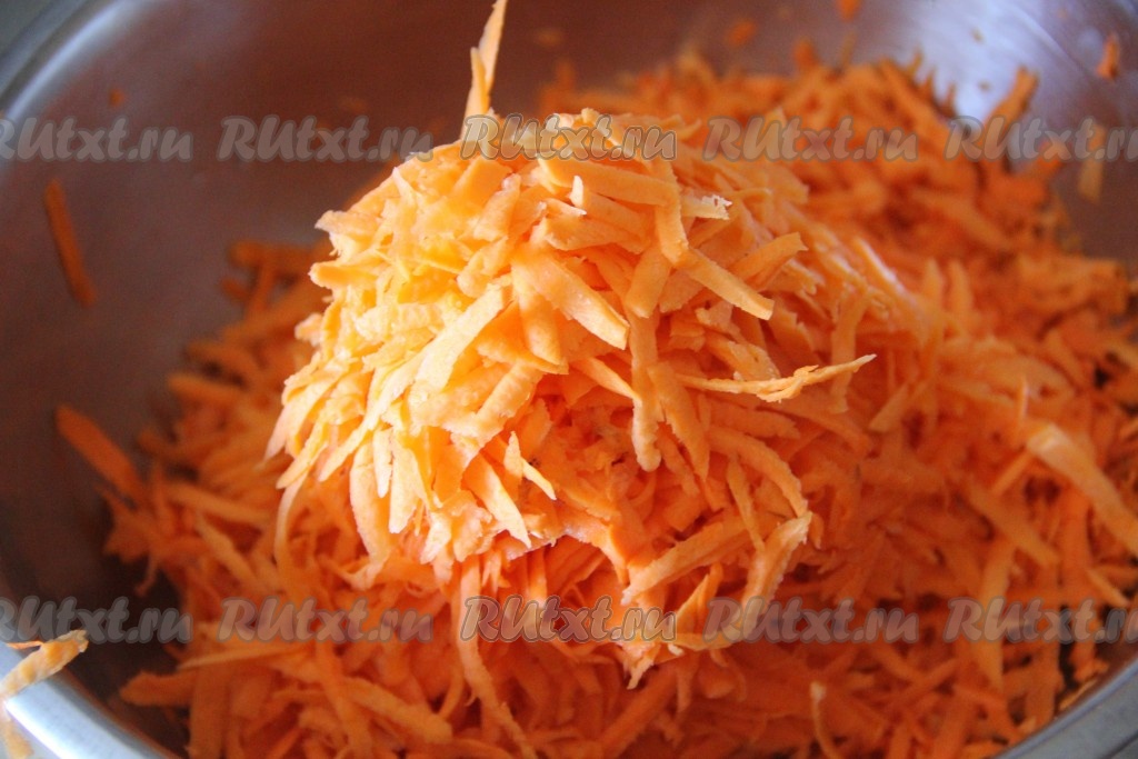 К луку добавить натертую на терке морковь. Обжарить до прозрачности.