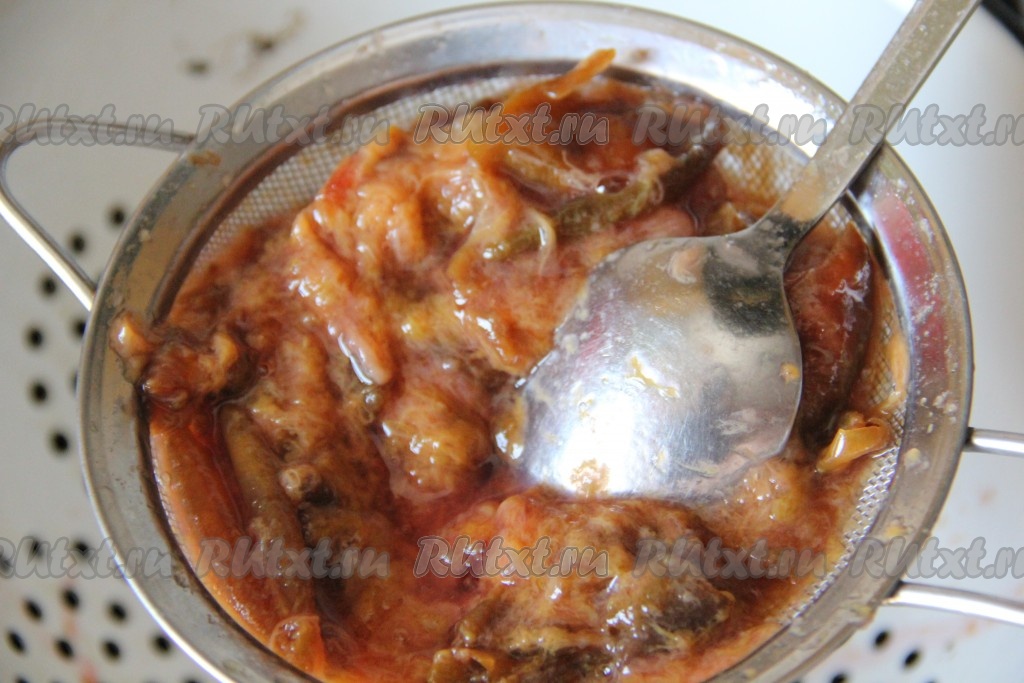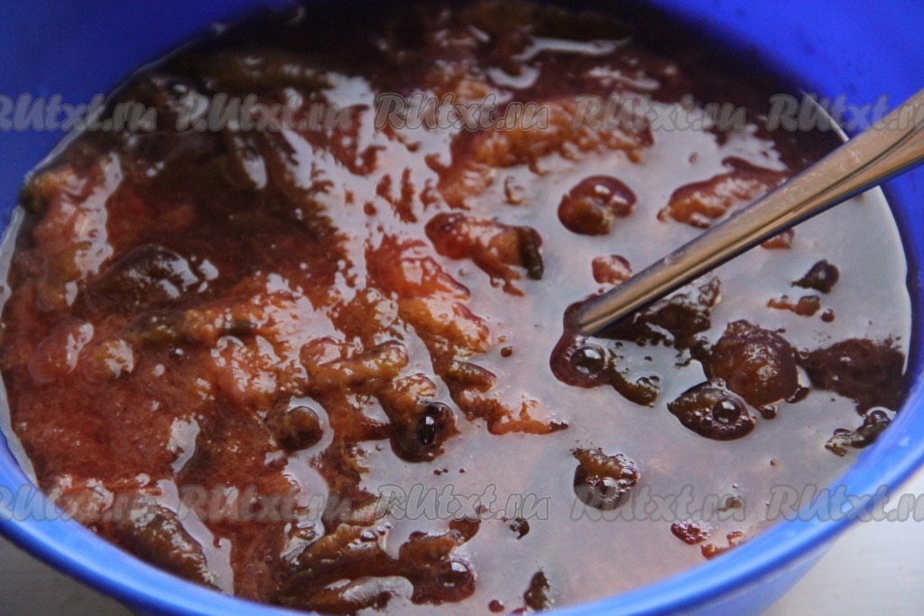 По истечении времени всю сливовую массу процедить через дуршлаг. Процеженную жидкость оставить, а шкурки и мякоть выбросить или использовать в качестве начинки для пирога.