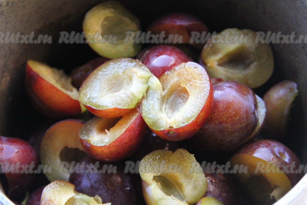 Сливы вымыть, вынуть косточки и отправить на небольшой огонь, варить, периодически помешивая и снимая пену, 1 час.