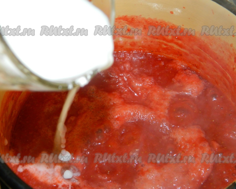 В стакан всыпать крахмал, влить 100 миллилитров холодной воды, тщательно перемешать. В закипевшую клубничную массу тонкой струйкой, постоянно помешивая, влить крахмальную смесь. Проварить на небольшом огне, помешивая, 1-2 минуты (до загустения клубничного соуса), убрать с огня.