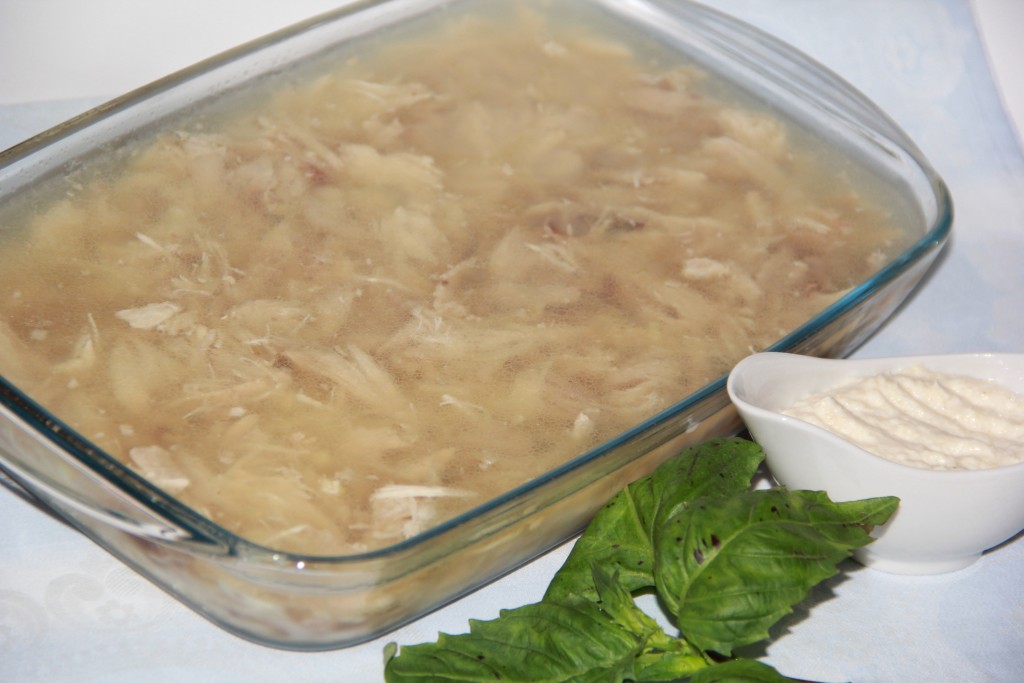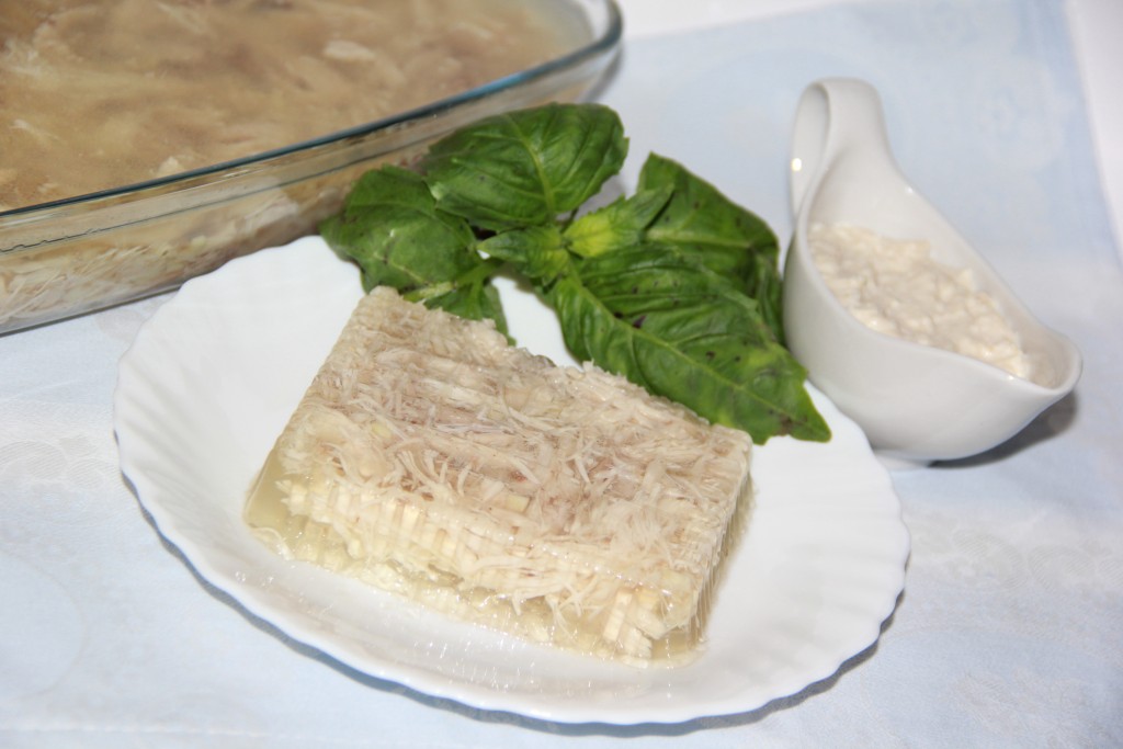 Поставить холодец из курицы в холодильник минимум на ночь. Подать с хреном или горчицей.