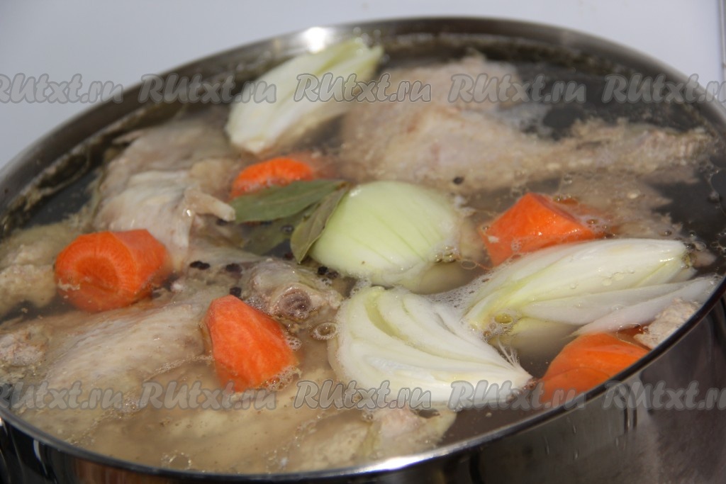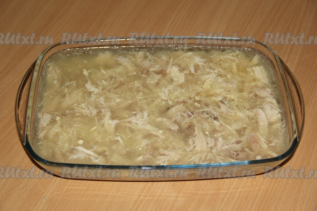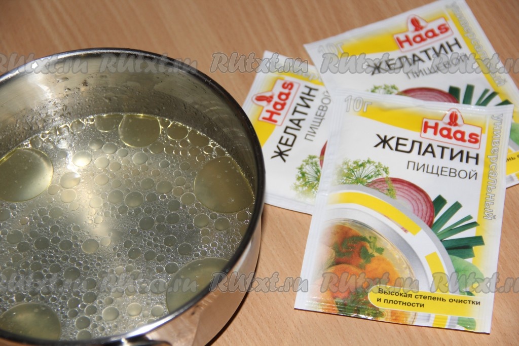 В бульон, который мы остудили, всыпать желатин и хорошо перемешать. Оставить желатин для набухания.