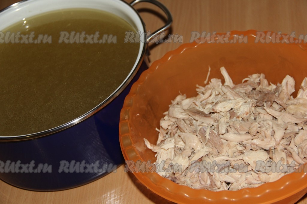 В конце варки холодца добавить в бульон соль и хорошо перемешать. Кастрюлю снять с огня и дать остыть. Далее вынуть мясо. Бульон процедить, добавить в него желатин и хорошо перемешать. Мясо курицы отделить от костей и кожи, по желанию можно мелко нарезать, а можно просто порвать на волокна.