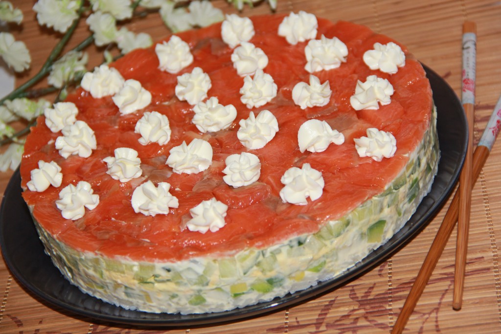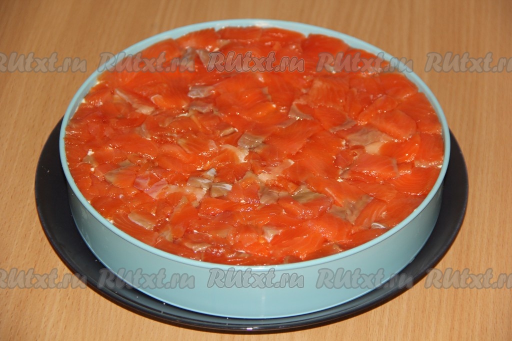 Выложить слой форели. Закрыть слоеный закусочный торт пищевой плёнкой и убрать в холодильник на пару часов.